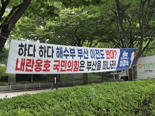 부산 시내 곳곳에 걸린 현수막에는 '하다 하다 해수부 부산 이전도 반대? 내란 옹호 국민의힘은 부산을 떠나라!"는 문구가 담겼다.