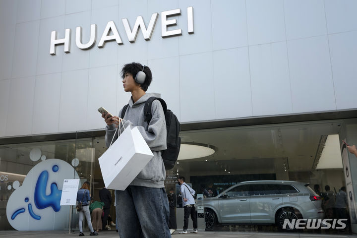 [베이징=AP/뉴시스] 중국 베이징에 있는 화웨이 매장에서 스마트폰을 구입한 남성이 밖으로 나가고 있다. 2024.05.26 |