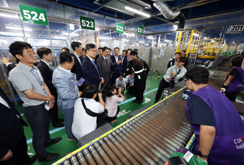 김병기 더불어민주당 당대표 직무대행 겸 원내대표가 16일 오전 서울 서초구 쿠팡 서초1캠프를 찾아 폭염대응 배송인력 작업 현장을 살펴하고 있다. (공동취재) 뉴시스 |