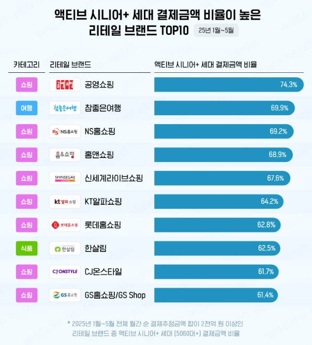 16일 앱 분석 서비스 와이즈앱·리테일에 따르면 올해 1~5월 5060세대 결제액 비중이 높은 리테일 브랜드 상위 10개 중 8개가 홈쇼핑 업체였다.