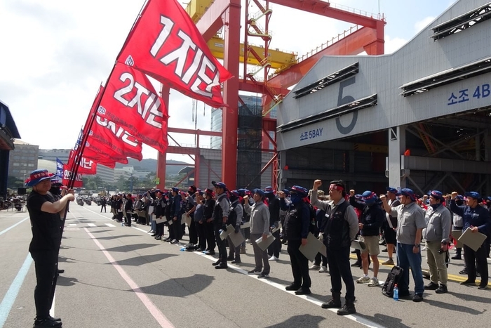 지난 11일 올해 첫 파업에 나선 HD현대중공업 노조 <자료=HD현대중공업 노조> |