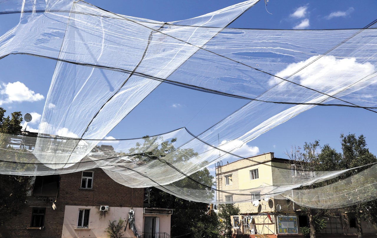 15일 우크라이나 동부 자포리자주의 소도시 오리히우 거리에 그물망이 쳐져 있다. 우크라이나군이 러시아의 드론 공격으로부터 지역 주민과 시설의 안전을 지키고, 드론을 이용한 러시아군 정찰을 훼방 놓기 위한 목적으로 그물망을 설치했다. 러시아가 최근 드론을 앞세워 우크라이나에 대한 공세를 강화하자, 도널드 트럼프 미국 대통령이 우크라이나에 대한 첨단 무기 지원 방침을 밝히면서 교착 국면이 길어질 것이라는 전망이 나온다. 드론은 우크라이나에서도 러시아에 항전하는 핵심 무기로 활용되고 있다.