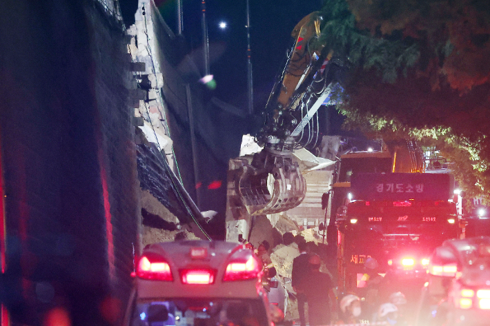 폭우로 비 피해도 속출해 경기도 오산에서는 어제 밤 10미터 높이의 옹벽이 무너지면서 지나가던 차량을 덮쳐 운전을 하던 40대 남성이 숨졌다.