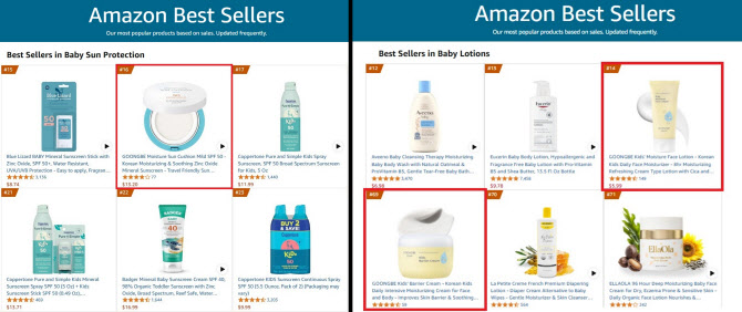 총 11개 품목이 아마존 베이비 스킨케어, 베이비 로션, 베이비 바디워시 등 주요 카테고리 베스트셀러에 이름을 올리는 성과를 거뒀다.
