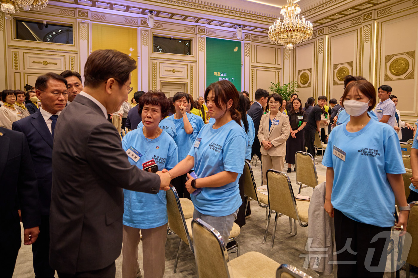이재명 대통령이 지난 16일 청와대 영빈관에서 열린 ‘기억과 위로, 치유의 대화’ 사회적 참사 유가족 간담회에서 유가족들과 인사를 하고 있다 (대통령실 제공. 재판매 및 DB 금지) 2025.7.17/뉴스1 ⓒ News1 이재명 기자 |
