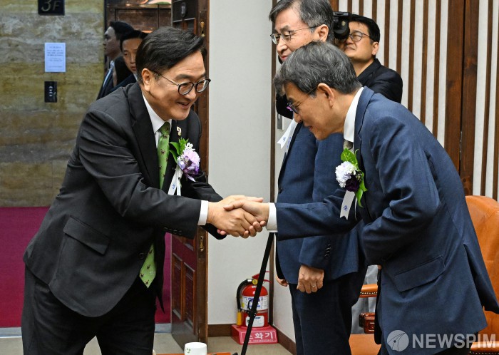 [서울=뉴스핌] 정일구 기자 = 우원식 국회의장이 17일 오전 서울 여의도 국회에서 열린 제77주년 제헌절 경축식에 앞서 노태악 중앙선거관리위원회 위원장과 인사를 나누고 있다. 2025.07.17 mironj19@newspim.com