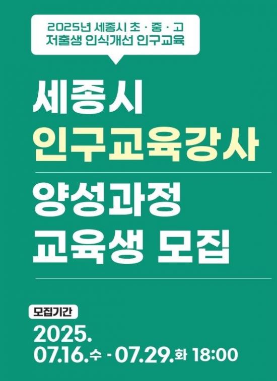 세종시와 (재)세종인재평생교육진흥원이 인구 위기 극복을 위한 '인구교육강사 양성과정' 참여자를 모집한다고 17일 밝혔다.