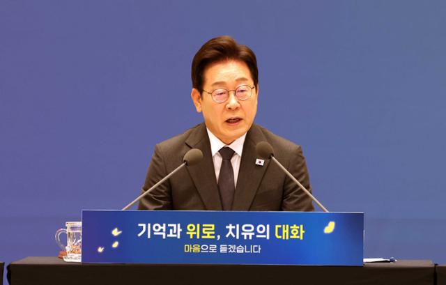 이재명 대통령이 16일 서울 종로구 청와대 영빈관에서 열린 '기억과 위로, 치유의 대화'에서 모두발언을 하고 있다. 왕태석 선임기자 |