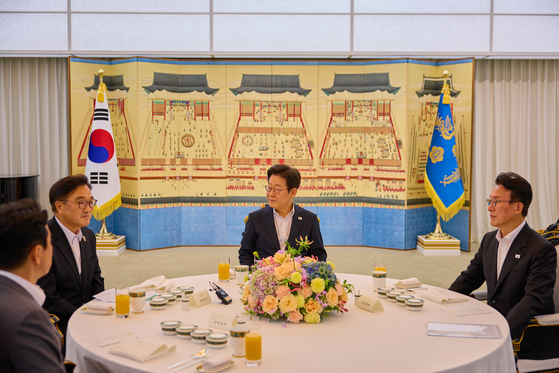 이재명 대통령이 17일 저녁 서울 용산구 한남동 대통령 관저에서 우원식 국회의장, 김민석 국무총리, 강훈식 비서실장과 만찬을 하고 있다. 대통령실 제공 |