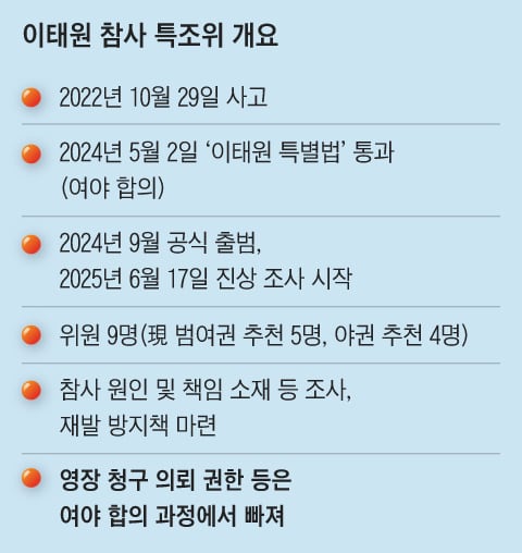 이미 민주당은 2022년 말 이 사고와 관련해 진상 조사를 하겠다며 국회 국정조사 특위를 가동해 55일간 활동했었다. 작년 5월 ‘이태원 특별법’ 협상에선 특조위의 불송치·수사 중지 사건에 관한 직권 조사, 압수수색영장 청구 의뢰권 조항을 넣었다가 독소 조항 논란이 일자 이 부분을 제외하기로 국민의힘과 합의했다. 현재 사고 책임자들은 경찰과 검찰 수사를 거쳐 재판을 받고 있다.