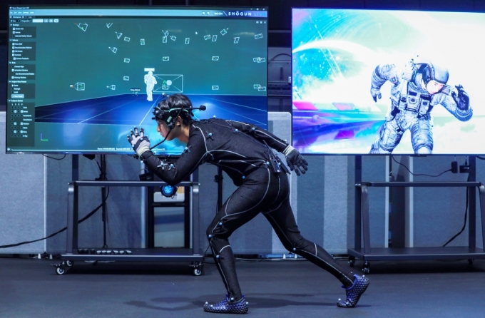 이날 시연회에서 네이버 직원의 움직임이 실시간으로 캡쳐돼 비전스테이지를 배경으로 움직이는 우주인으로 나타났다./사진제공=네이버 |