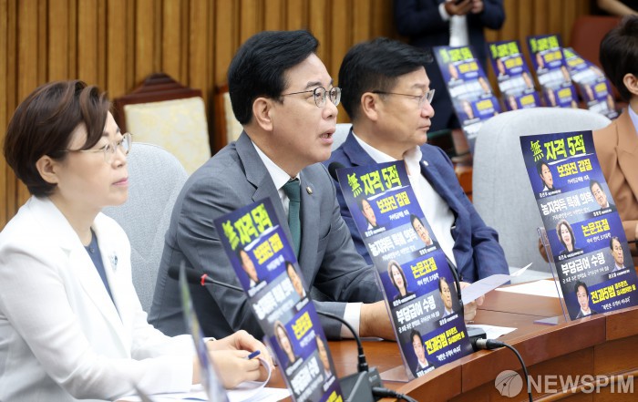 [서울=뉴스핌] 정일구 기자 = 송언석 비상대책위원장 겸 원내대표가 18일 오전 서울 여의도 국회에서 열린 원내대책회의에서 모두발언을 하고 있다. 2025.07.18 mironj19@newspim.com