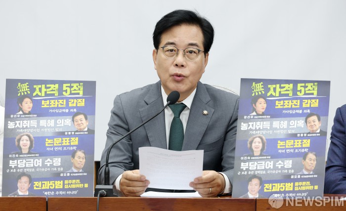 [서울=뉴스핌] 정일구 기자 = 송언석 비상대책위원장 겸 원내대표가 18일 오전 서울 여의도 국회에서 열린 원내대책회의에서 모두발언을 하고 있다. 2025.07.18 mironj19@newspim.com