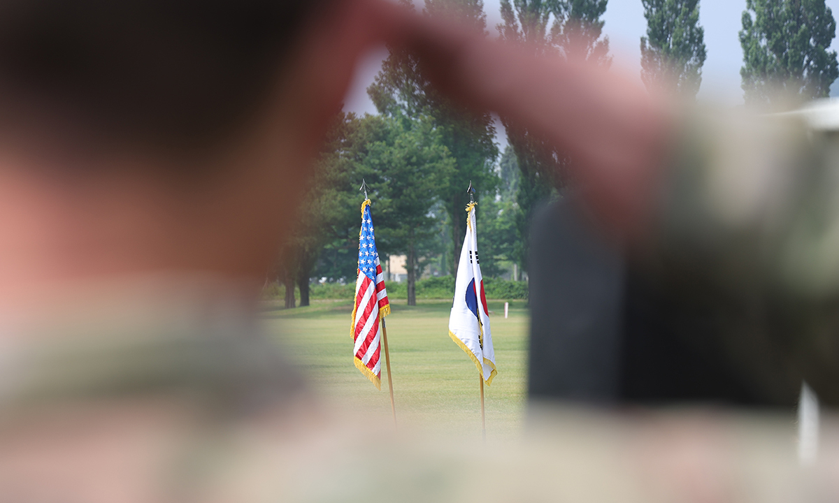 주한미군 장병이 태극기와 성조기를 향해 경례하고 있다. 연합뉴스 |