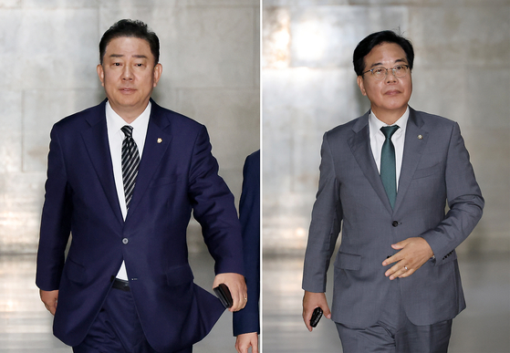 김병기(왼쪽 사진) 더불어민주당 대표 직무대행 겸 원내대표와 송언석(오른쪽 사진) 국민의힘 비상대책위원장 겸 원내대표가 18일 오후 서울 여의도 국회 운영위원장실에서 열린 여야 원내대표 회동을 위해 이동하고 있다. 뉴시스 |