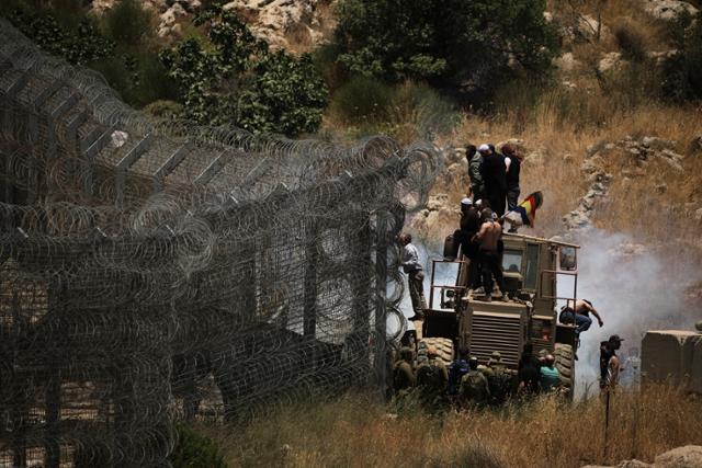 16일 시리아-이스라엘 접경 지역에서 드루즈 부족이 시위를 벌이는 모습이 이스라엘이 지배하는 골란고원 마즈달샴스에서 관측되고 있다. 마즈달샴스=AP 뉴시스 |