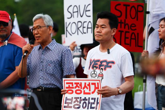 한국사 강사 전한길씨가 30일 경기도 과천 중앙선거관리위원회 청사 앞에서 공정선거 보장을 촉구하는 보수단체 집회에 참가하고 있다. 뉴시스 |