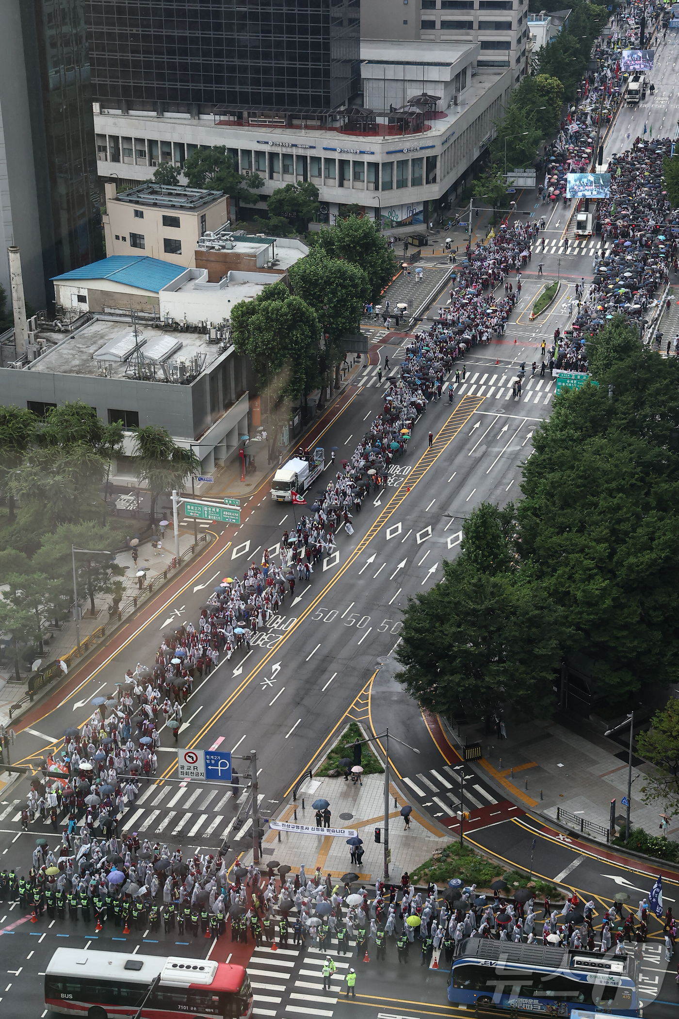 (서울=뉴스1) 김도우 기자 = 민주노총 조합원들이 19일 서울 중구 을지로 일대에서 2025민주노총, 총파업·총력투쟁 대행진 집회에서 행진을 하고 있다. 2025.7.19/뉴스1