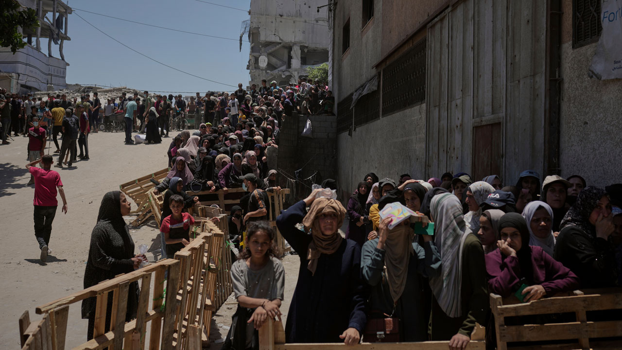 ▲ 가자지구 북부 가자시티에서 팔레스타인 주민들이 세계식량계획(WFP)이 배급하는 밀가루 자루를 받기 위해 줄을 서고 있다.