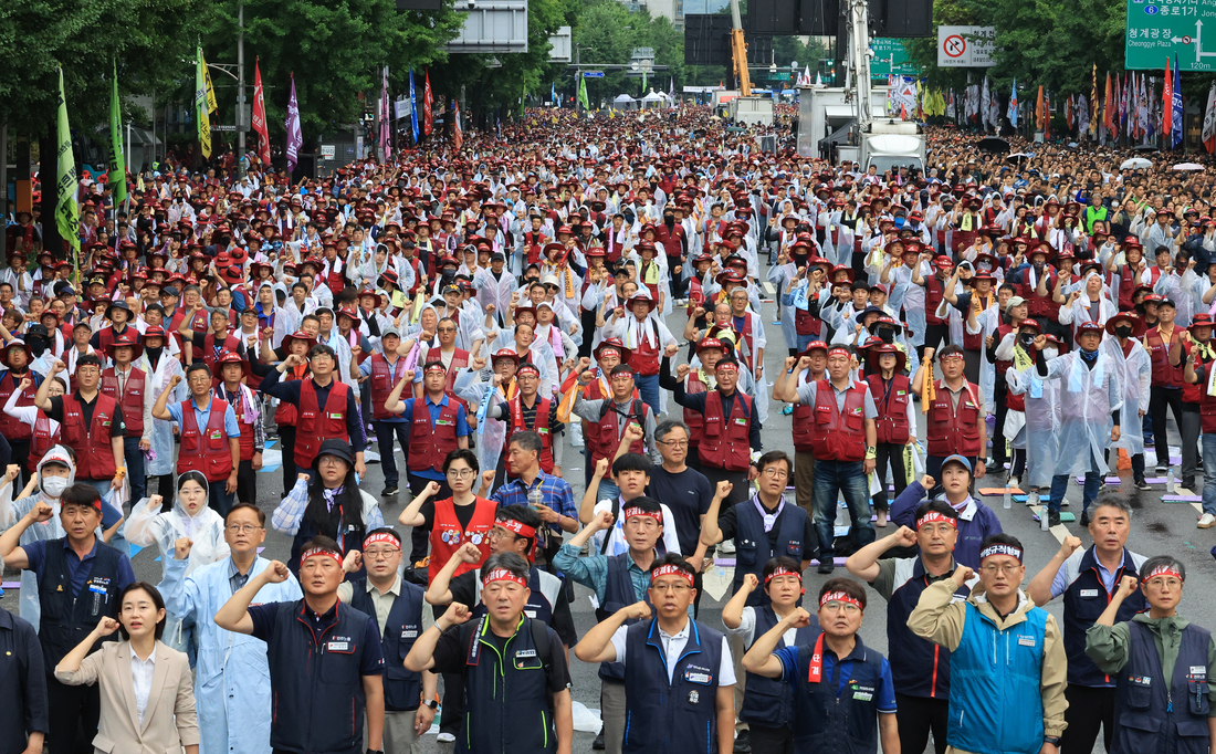 이날 민주노총 산별노조인 건설산업연맹 전국플랜트건설노조는 건설노동자 퇴직공제부금 인상과 적용 확대 등을 요구하는 사전대회를 연 뒤 본대회에 합류했다. 이주안 플랜드건설노조 위원장은 “이재명 정부가 윤석열 정부의 반노동 정책을 폐기하고 노동자와 시민의 생존권이 보장되는 평등한 세상을 위한 사회 대개혁을 실현해야 한다”고 주장했다.