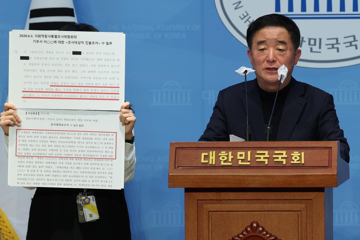 강득구 더불어민주당 의원이 21일 오전 서울 여의도 국회에서 ‘세월호 침몰 경위 및 국정원’ 관련 기자회견을 하고 있다. 2024.03.21. 서울=뉴시스 |