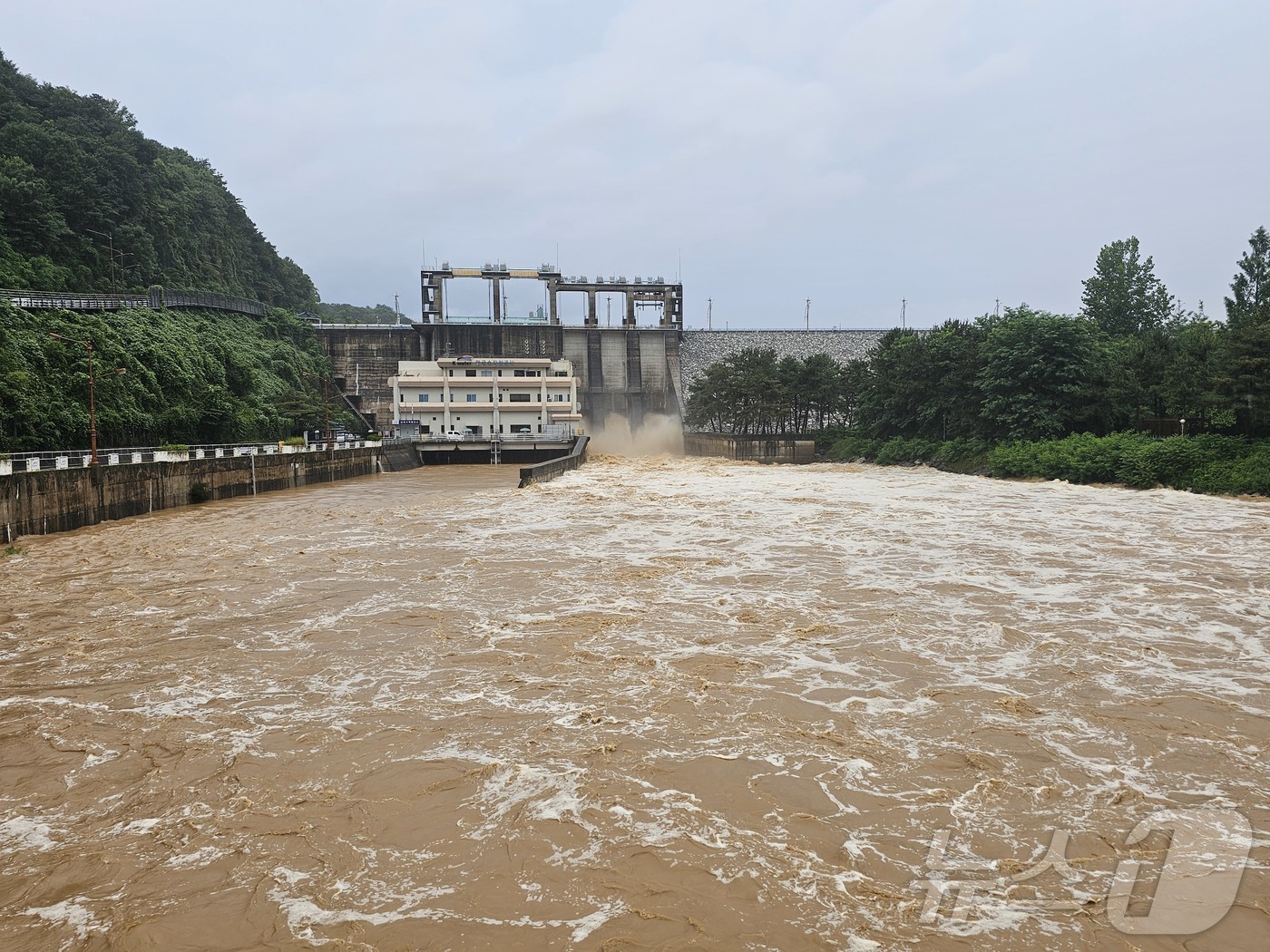 19일 경남 진주 남강댐이 연일 이어지는 집중호우에 따른 수위조절을 위해 방류를 실시하고 있다. 2025.7.19/뉴스1 ⓒ News1 한송학 기자 |