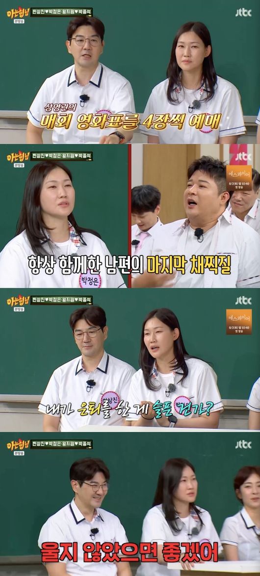 박정은 못지않게 한상진도 적극적인 아내의 외조를 자랑했다. 박정은은 “은퇴를 선언하고 시즌을 시작했다. 나는 선수 생활을 할 만큼 다 했다. 시원했다. 옆에서 계속 펑펑 우는 것이다. 내가 은퇴를 해서 슬픈 건가, 농구를 못 봐서 슬픈 건가. 농구장에 오는 건 괜찮은데 아무 데서나 울지 않았으면 좋겠다”라고 말했다.