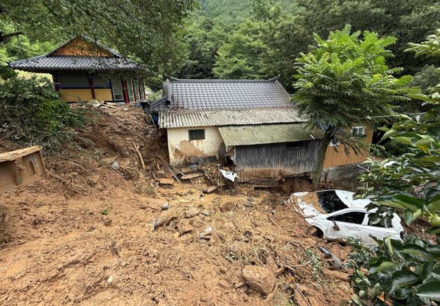 18일 경북 청도군 청도읍 구미리 주택 옆에 차량 한 대가 전날 집중호우 때 쏟아진 토사에 파묻혀 있다. 청도=뉴스1 |