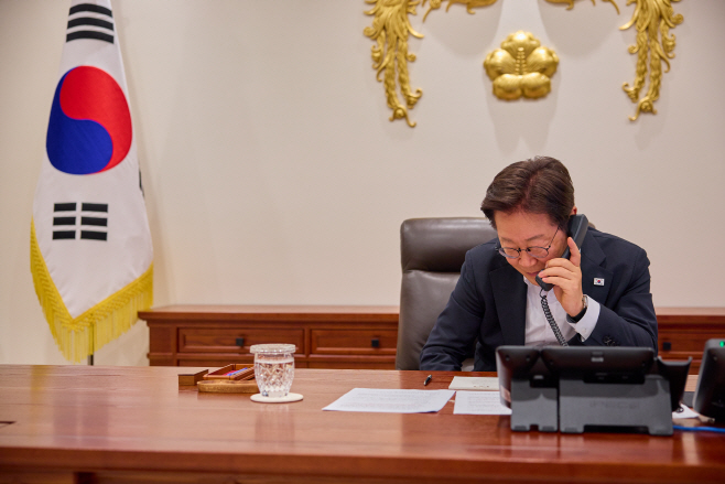 이재명 대통령이 17일 서울 용산 대통령실 청사 집무실에서 레제프 타이이프 에르도안 튀르키예 대통령과 전화 통화를 하고 있다. /제공=대통령실 |