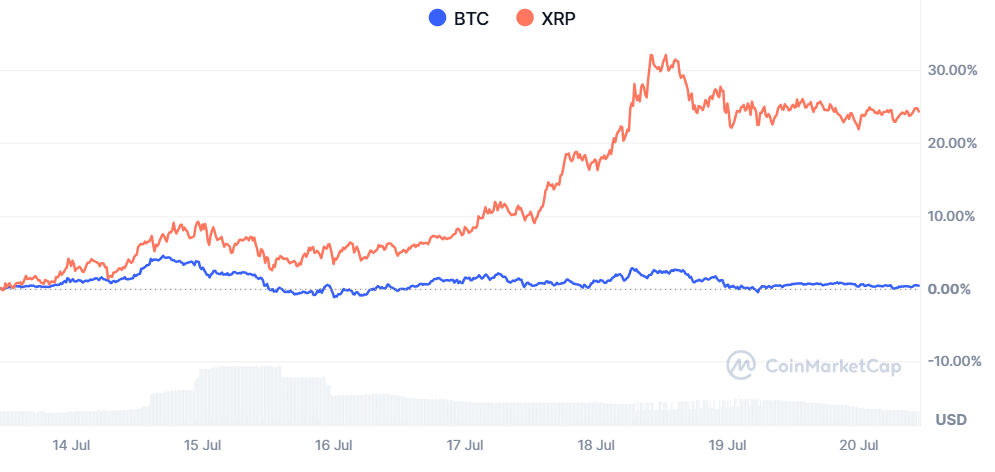 최근 7일간 비트코인(BTC)과 리플(XRP) 시세 비교 (출처=코인마켓캡) |
