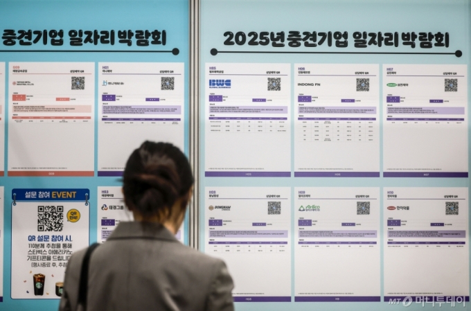 [서울=뉴시스] 정병혁 기자 = 23일 서울 강남구 코엑스에서 열린 2025년 중견기업 일자리 박람회를 찾은 한 구직자가 채용정보 게시판을 살펴보고 있다. 2025.04.23. jhope@newsis.com /사진=정병혁 |