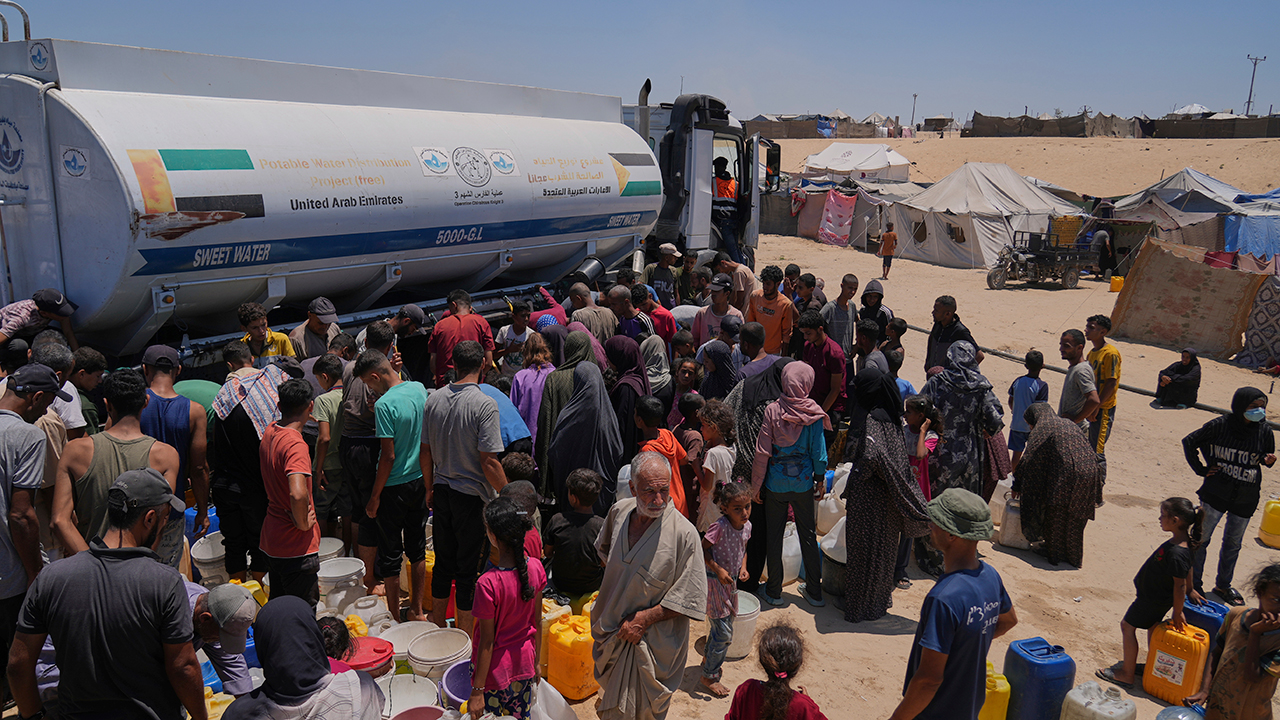 ▲ 지난 19일(현지시간) 가자지구 남부 칸유니스 구호소 물탱크 트럭 앞에 물을 받으려고 모인 팔레스타인 주민들