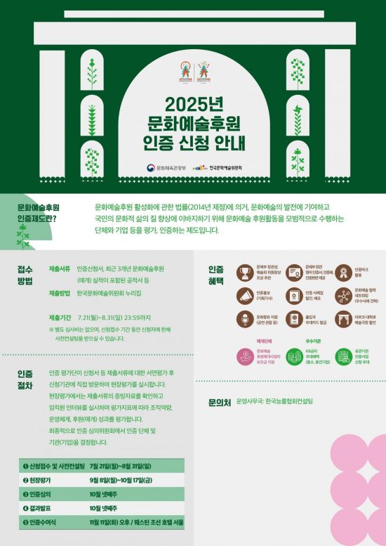 이번 인증 신청은 민간의 문화예술후원 활성화와 후원 역량 강화를 목표로, 문화예술후원 매개의 전문성을 갖춘 단체와 문화예술후원 성과를 낸 기업(기관)을 선정하기 위해 마련됐다.