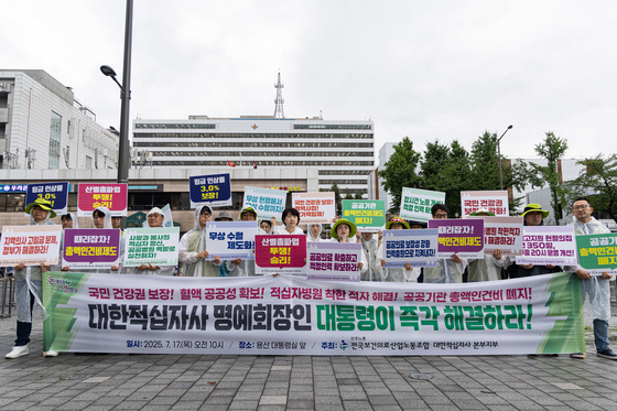 민주노총 전국보건의료산업노동조합 대한적십자사 본부지부 조합원들이 17일 오전 서울 용산구 대통령실 앞에서 열린 대한적십자사본부 파업 예고 기자회견에서 발언을 하고 있다. 뉴스1 |