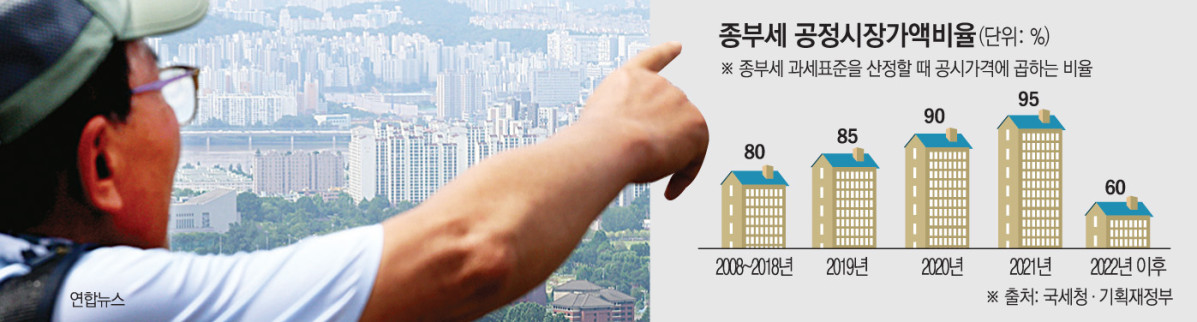 21일 정부와 부동산 업계 등에 따르면 정부는 종부세 공정비율을 현행 60%에서 80%로 상향하는 안을 검토하는 것으로 알려졌다. 2008년 도입된 종부세 공정비율은 종부세 과세표준을 산정할 때 공시가격에 곱하는 비율을 말한다. 이 비율은 문재인 정부 때 95%까지 올랐다가 윤석열 정부 때인 2022년 다시 60%로 낮아져 지금까지 유지됐다. 현재 법에서 정한 종부세 공정비율은 60~100%이기 때문에 비율 조정은 법 개정 없이 시행령 수정으로 즉시 적용할 수 있다. 당장 이번 세제 개편에 관련 내용을 담지 않더라도 내년 6월 1일 이전에 시행령 개정으로 공정비율을 조정할 수 있다.