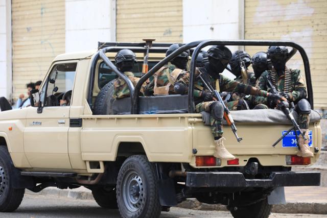 후티 반군이 20일 예멘 수도 사나에서 픽업 트량에 타 주변을 정찰하고 있다. 사나=EPA 연합뉴스 |