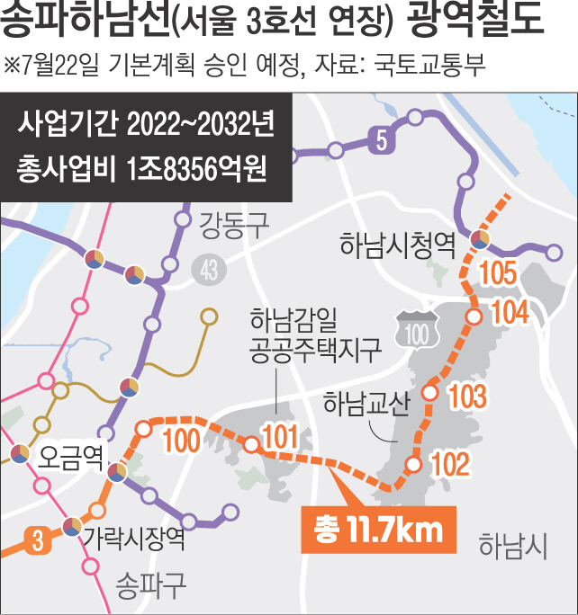 2032년 개통을 목표로 건설되는 송파하남선은 서울 3호선 종점을 오금역에서 하남시청역까지 연장하는 총길이 11.7㎞의 광역철도 노선으로, 기존 서울 도심과 경기 하남 감일·교산 신도시를 경유한다.