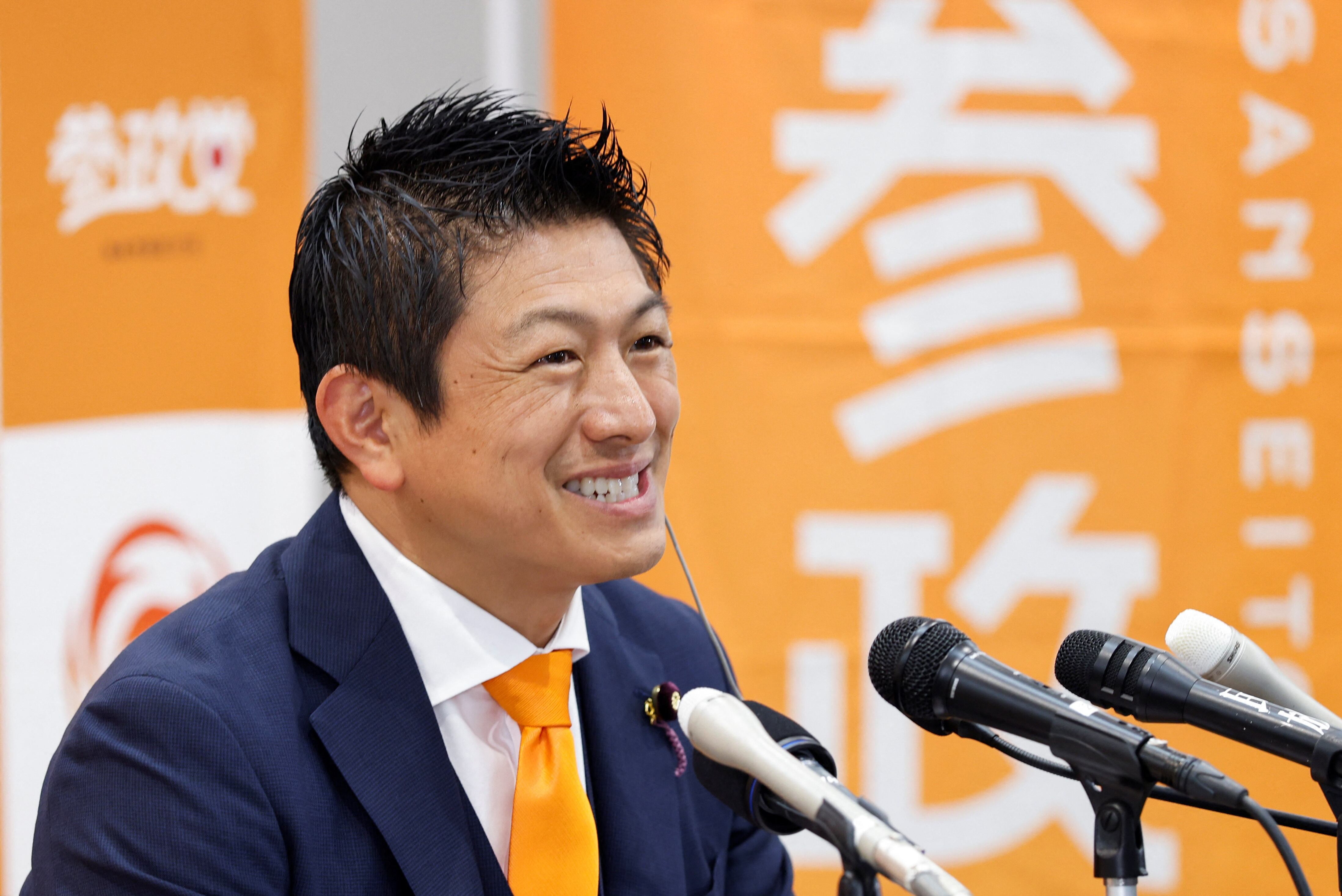 일본 산세이토당 대표 가미야 소헤이가 2025년 7월 20일 일본 도쿄의 당 본부에서 참의원 선거 당일 기자들에게 연설하고 있다. /로이터 연합뉴스 |