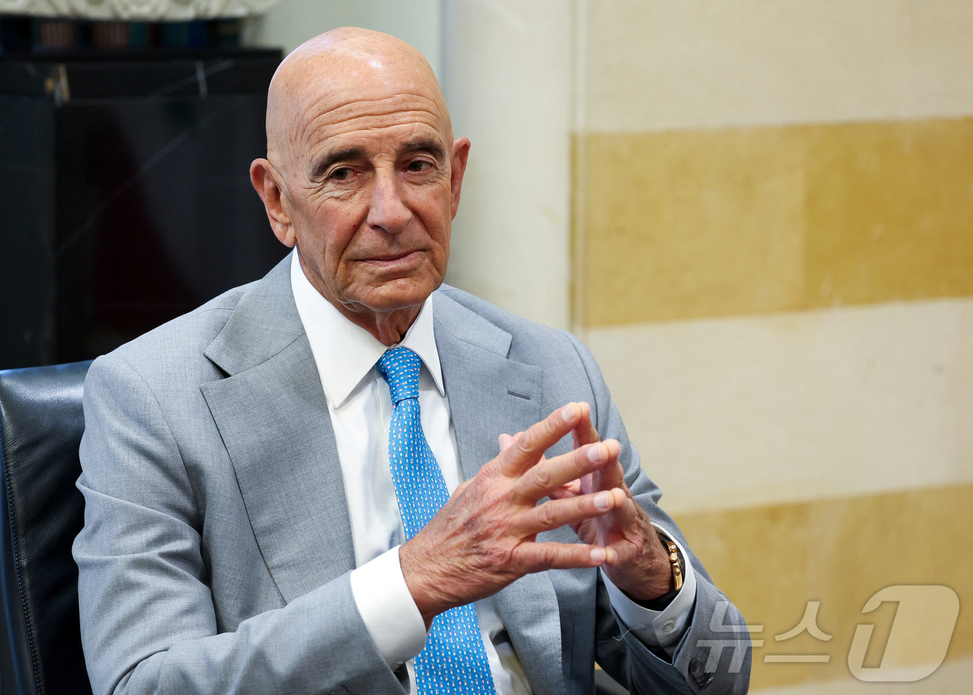 토머스 배럭 튀르키예 주재 미국 대사 겸 시리아 특사가 21일(현지시간) 레바논 수도 베이루트에서 나와프 살람 레바논 총리와 만나 면담한 뒤 기자회견에 나서고 있다. 2025.7.21 ⓒ 로이터=뉴스1 ⓒ News1 강민경 기자 |