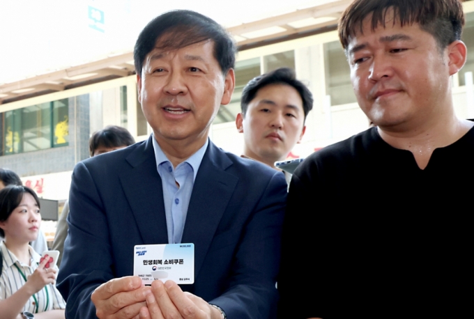 취임 첫 현장행보로 공주 산성시장을 방문한 구윤철 부총리 겸 기획재정부 장관은 기자들과 만나 "지금은 전반적으로 수요가 떨어져 오히려 재고가 쌓인 상황이지만 특정 품목에 대해 (소비쿠폰) 수요가 몰리면 (물가상승이) 일어날 수 있다"며 "특정품목이 소비쿠폰으로 인해 과다하게 (수요가) 올라가지 않도록 모니터링을 잘 하고, 그런 품목에 대해선 출하량을 늘리는 등 가능하면 스무드한 관리가 되도록 관리하겠다"말했다.