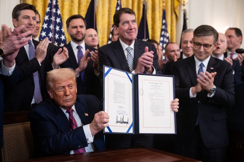 도널드 트럼프(왼쪽) 미국 대통령이 18일(현지시간) 워싱턴 백악관에서 공화당 의원들이 참석한 가운데 암호화폐 규제법인 이른바 지니어스법 서명식을 하고 있다. UPI 연합 |
