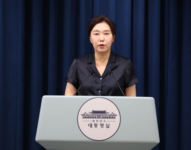 강유정 대통령실 대변인이 22일 서울 용산 대통령실 브리핑룸에서 강준욱 국민통합비서관 자진 사퇴 등 인사 관련 브리핑을 하고 있다. 대통령실사진기자단 |