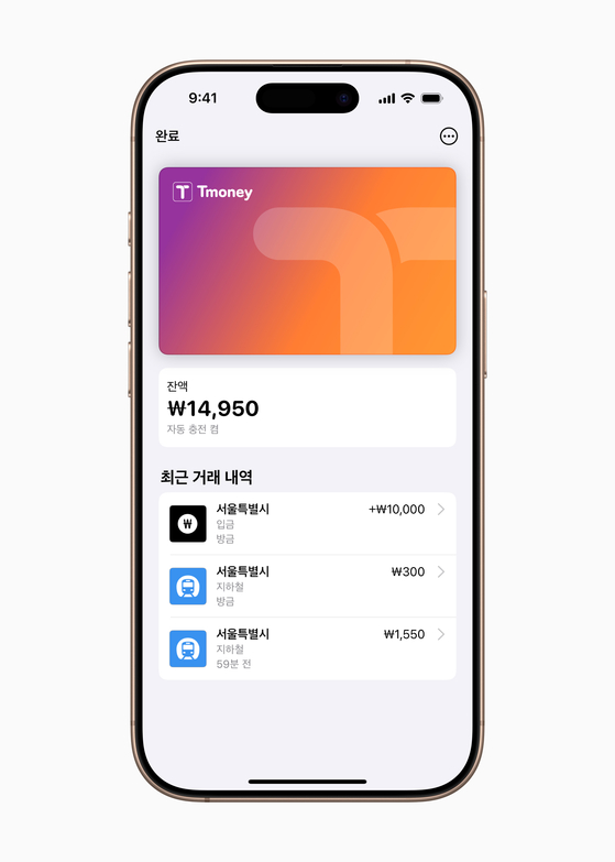 아이폰 사용자는 이날부터 애플지갑 앱에 티머니 카드를 추가한 뒤 아이폰 또는 애플워치를 버스·지하철 승하차 단말기에 태그해 대중교통을 이용할 수 있다. 아이폰 ‘익스프레스 모드’가 활성화된 상태에서는 기기를 잠금 해제하거나 켤 필요 없이 단말기에 가까이 대기만 하면 결제된다.