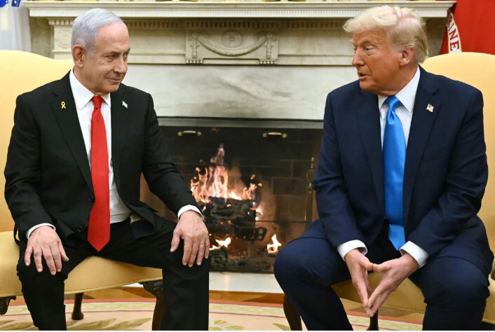 올해 2월4일(현지시각) 도널드 트럼프 미국 대통령(오른쪽)과 베냐민 네타냐후 이스라엘 총리(왼쪽)이 백악관에서 회담하고 있다. 워싱턴/로이터 연합뉴스 |