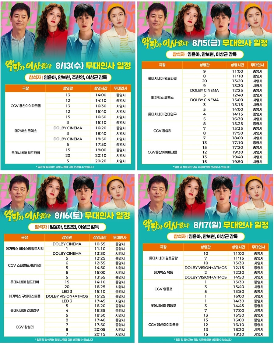 먼저 개봉일인 8월 13일에는 임윤아, 안보현, 주현영 그리고 이상근 감독이 CGV용산아이파크몰과 메가박스 코엑스, 롯데시네마 월드타워를 방문해 극장에 찾아온 관객들에게 직접 감사 인사를 전할 것이다. 이어 개봉주 금요일인 15일부터는 임윤아, 안보현, 이상근 감독이 롯데시네마 월드타워를 시작으로 메가박스 코엑스, 롯데시네마 건대입구, CGV왕십리, CGV용산아이파크몰까지 방문해 무대인사를 진행한다.