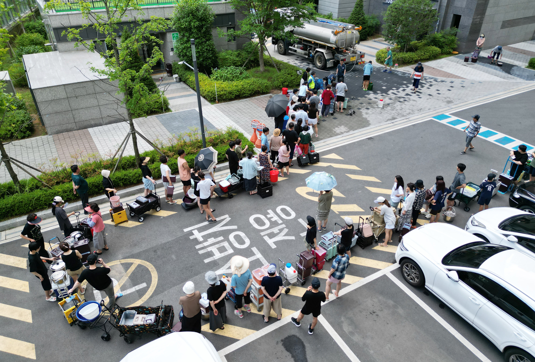 단수가 이어지고 있는 울산시 울주군 언양읍 한 아파트 주민들이 지난 21일 살수차에서 물을 받아 가기 위해 줄을 서 있다. 연합뉴스 |