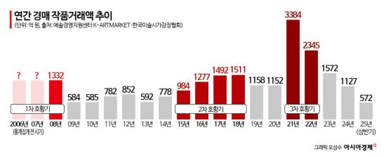 국내 미술 경매시장은 과거 두 차례에 걸쳐 뚜렷한 호황기를 겪었다. 첫 번째는 2006년부터 2008년까지로, 당시 케이옥션의 낙찰총액은 1856억원에 달했다. 직전 3년(2003∼2005년) 평균 대비 20배 이상 증가한 수준이다. 2008년 한 해 동안의 경매 거래액은 약 1300억원으로, 글로벌 금융위기가 불거진 2009년(584억원)의 2.5배에 달했다.