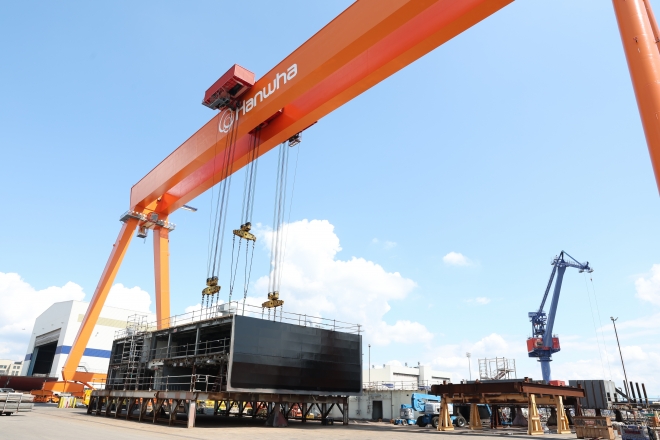 지난 16일(현지시간) 미국 펜실베이니아주 필라델피아 한화 필리조선소에서 한화필리십야드 골리앗크레인이 대형 블록을 이동시키기 위해 준비 중이다. 한화오션 제공 |