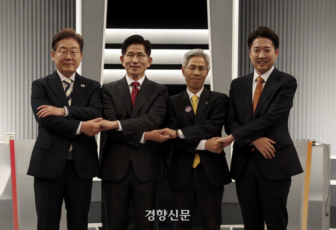 서울 영등포구 여의도 KBS 스튜디오에서 지난 5월 열린 중앙선거방송토론위원회 주관 제21대 대통령선거 후보자 토론회에 앞서 당시 이재명(왼쪽부터) 더불어민주당, 김문수 국민의힘 , 권영국 민주노동당, 이준석 개혁신당 대선후보가 기념촬영을 하고 있다. 국회사진기자단 |