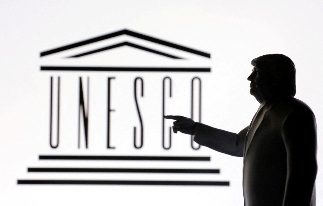 유네스코 로고를 배경으로 도널드 트럼프 미국 대통령의 3D 프린팅 미니어처 모형이 보인다. 로이터연합뉴스 |